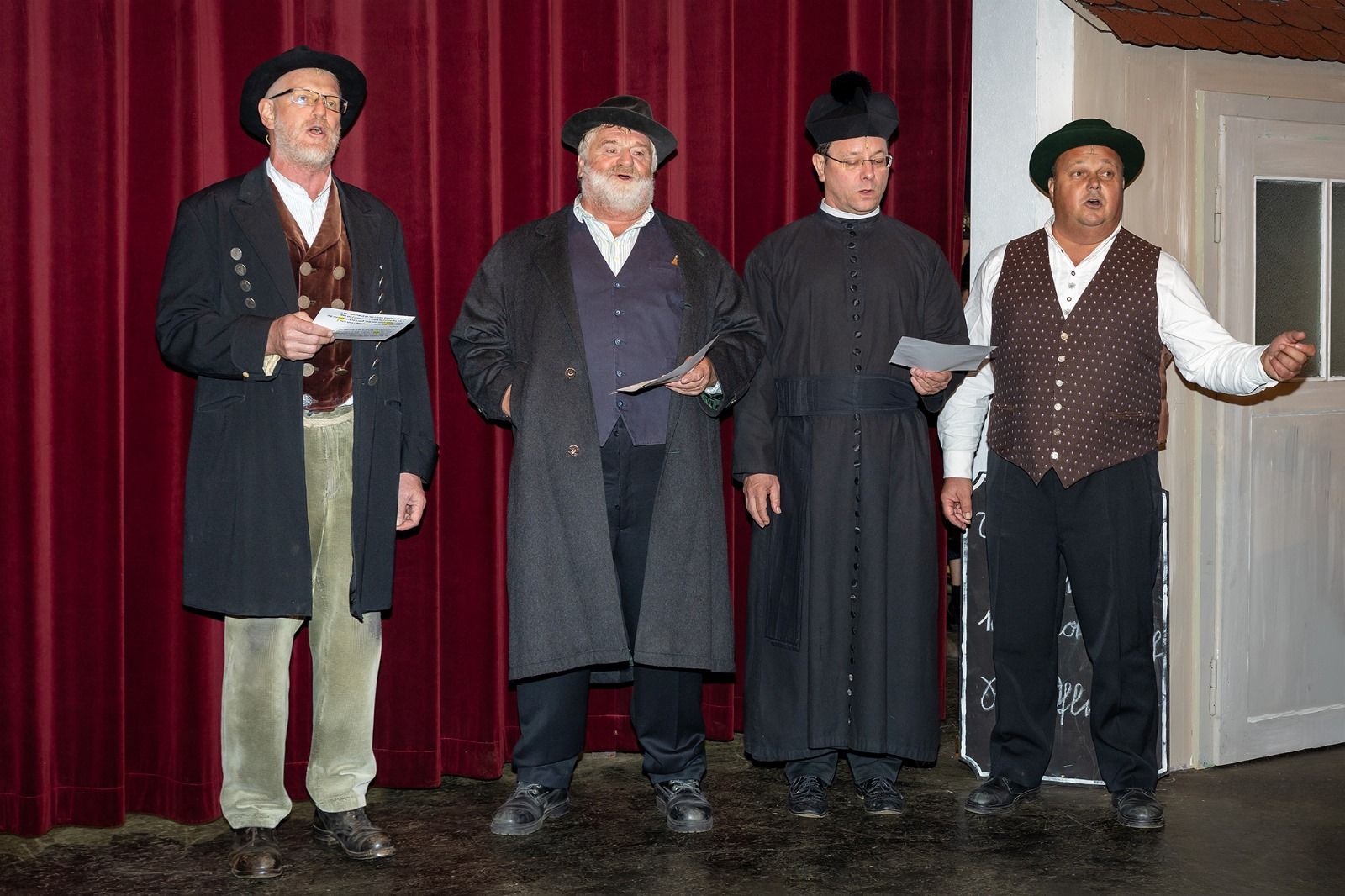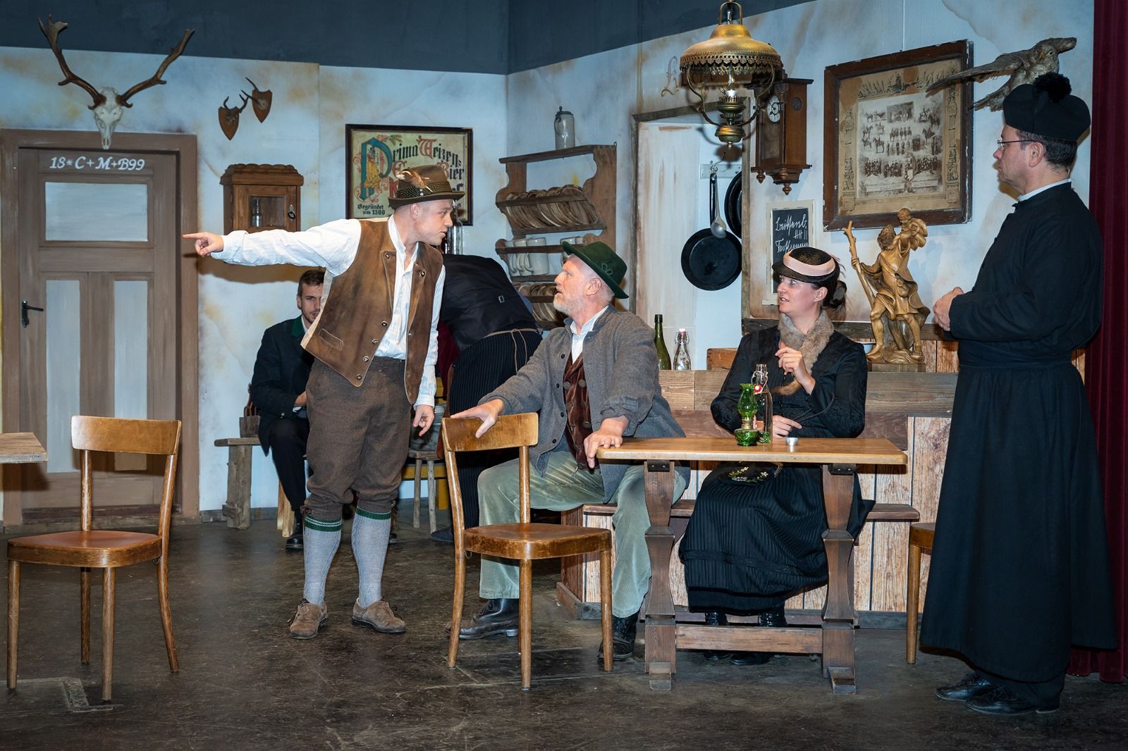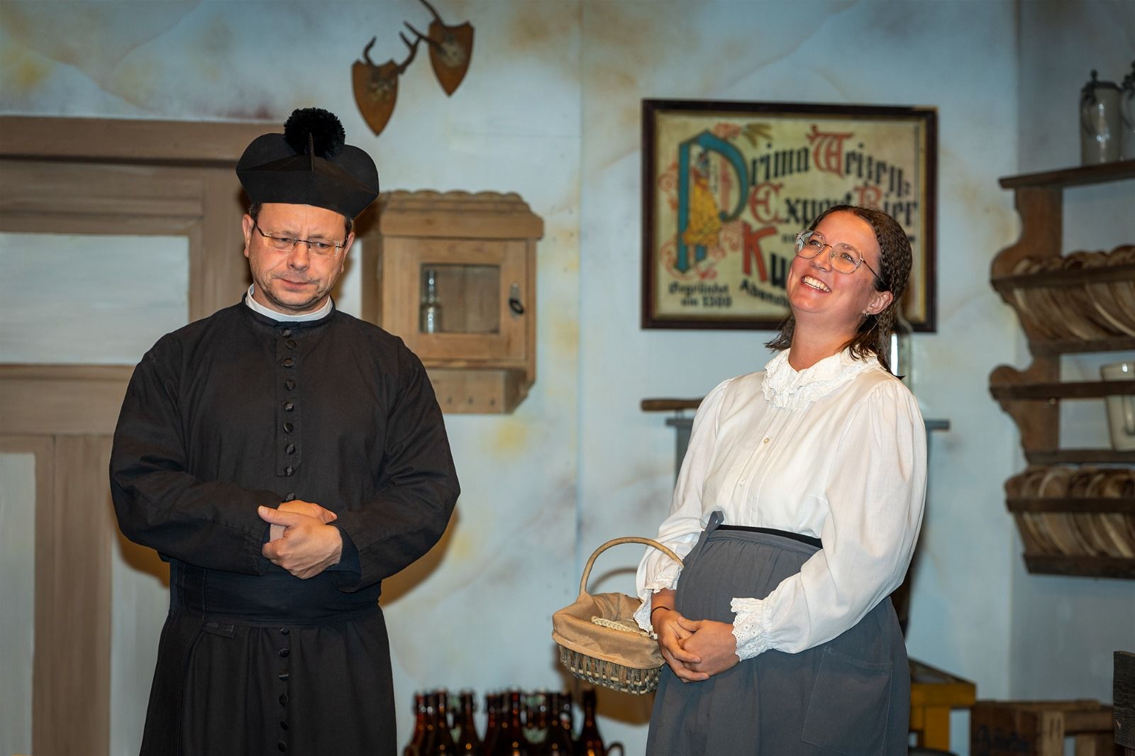 Als „gestrenger“ Dorfpfarrer sieht Christian Jaksch hin und wieder über die „leidlichen“ Fehler seiner „Schäfchen“, vor allem der Pfarrersköchin, gespielt von Sabrina Müller, hinweg. Die Verzweiflung des Bürgermeisters Josef Xidinger über sein Schicksal ist Christian Hauber ins Gesicht geschrieben.