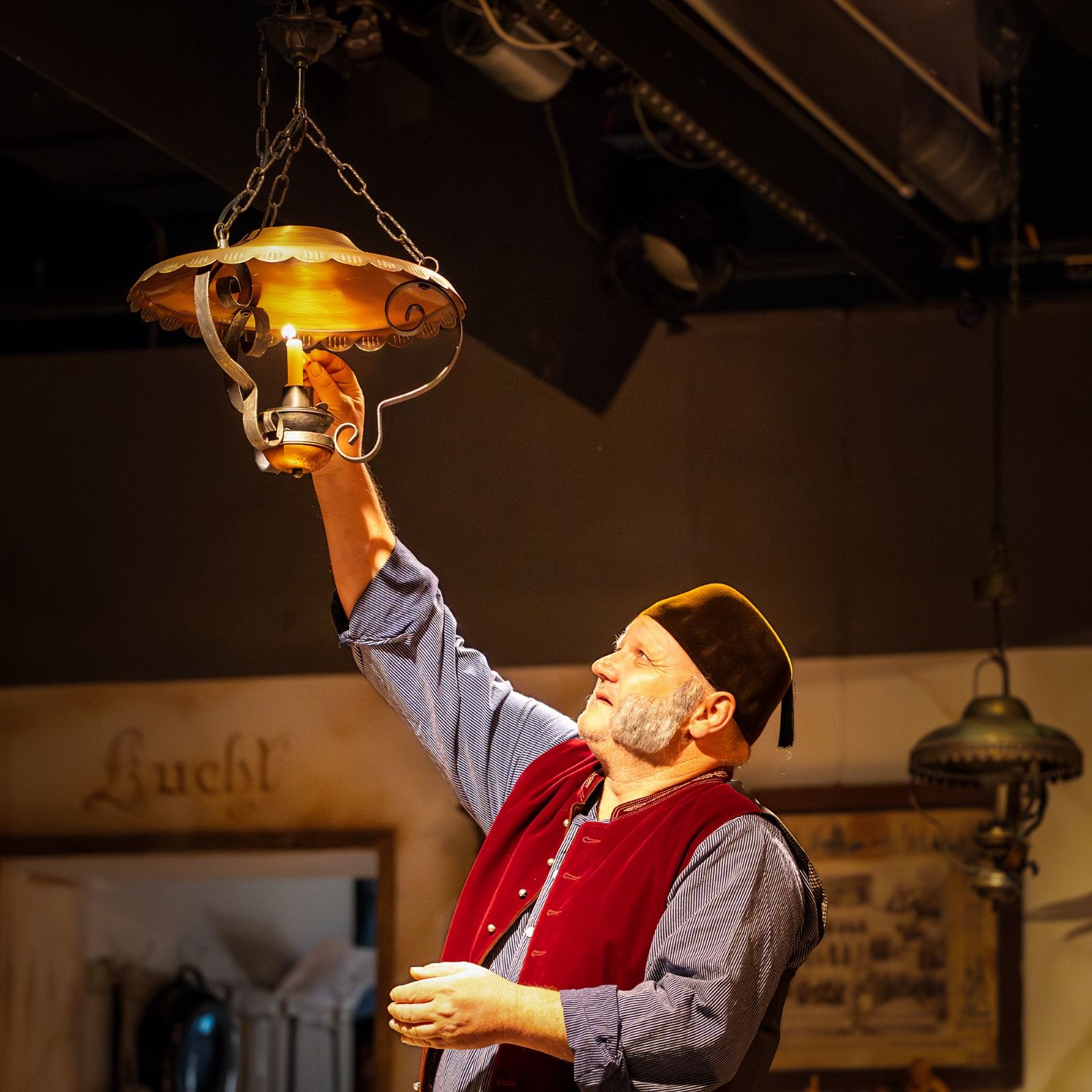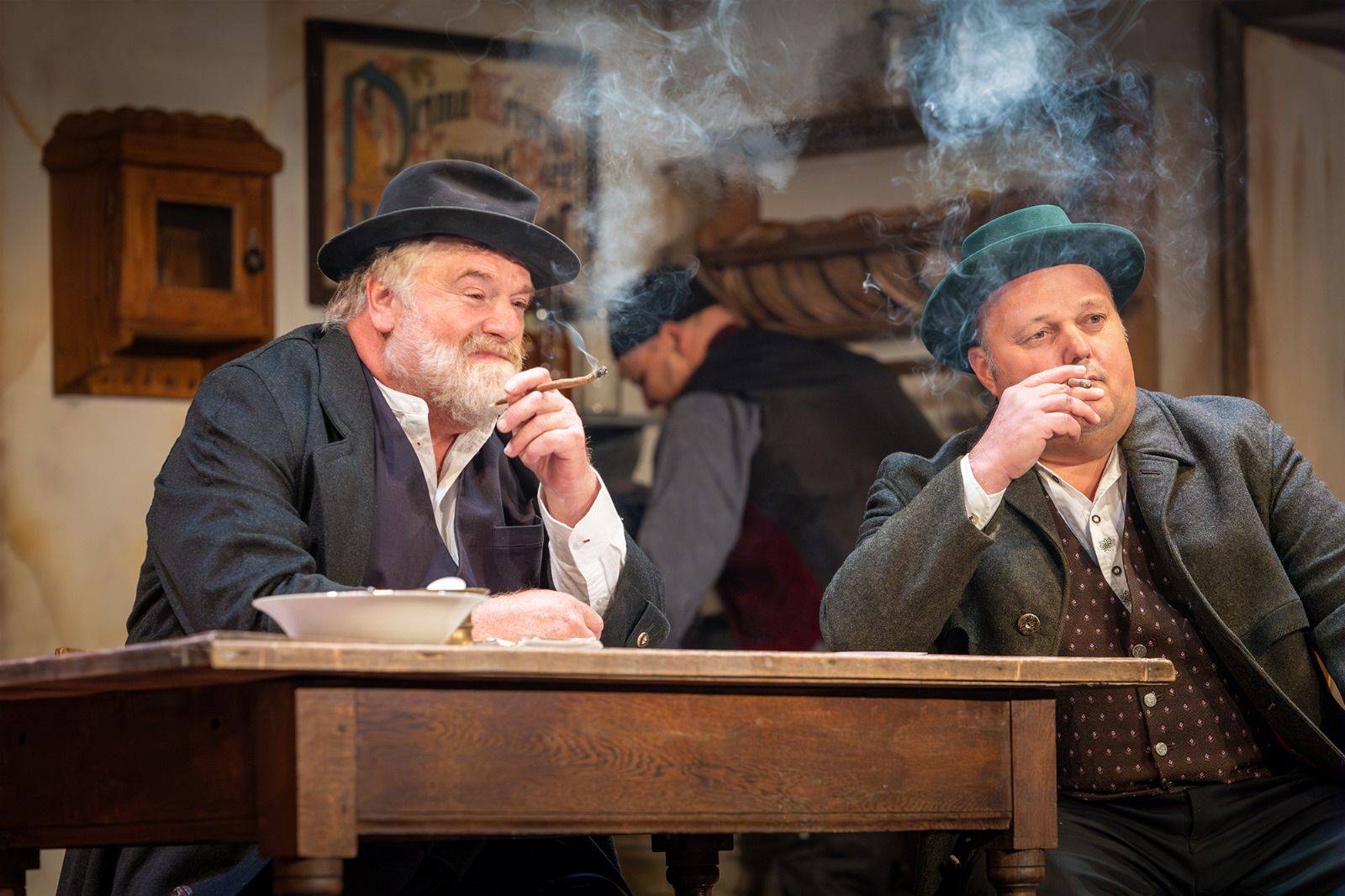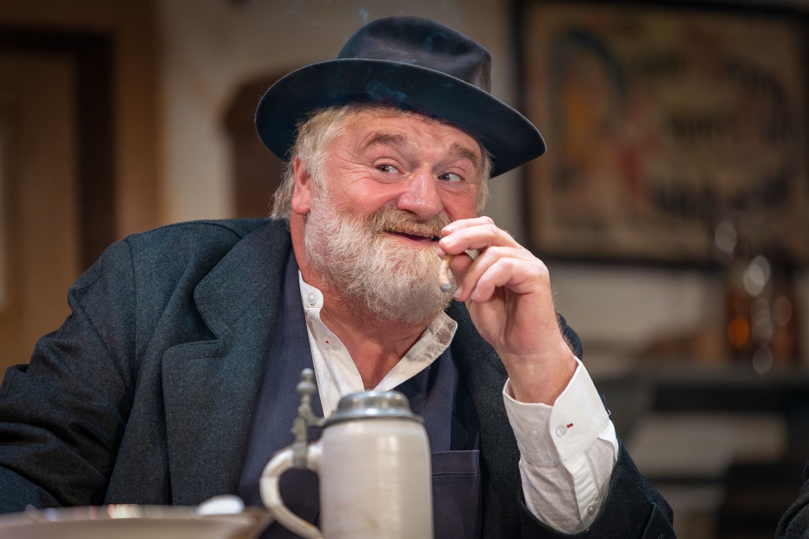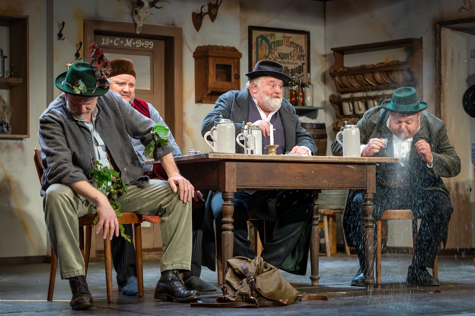 Der Zuschauer muss immer die ganze Bühne im Blick haben. Ob am Wirtshaustisch, am seitlichen Stammtisch, hinten beim Bierfass oder im Hergottseck, die Handlung ist gespickt mit kuriosen, kaum auffallenden, spitzbübischen Aktionen der Darsteller.