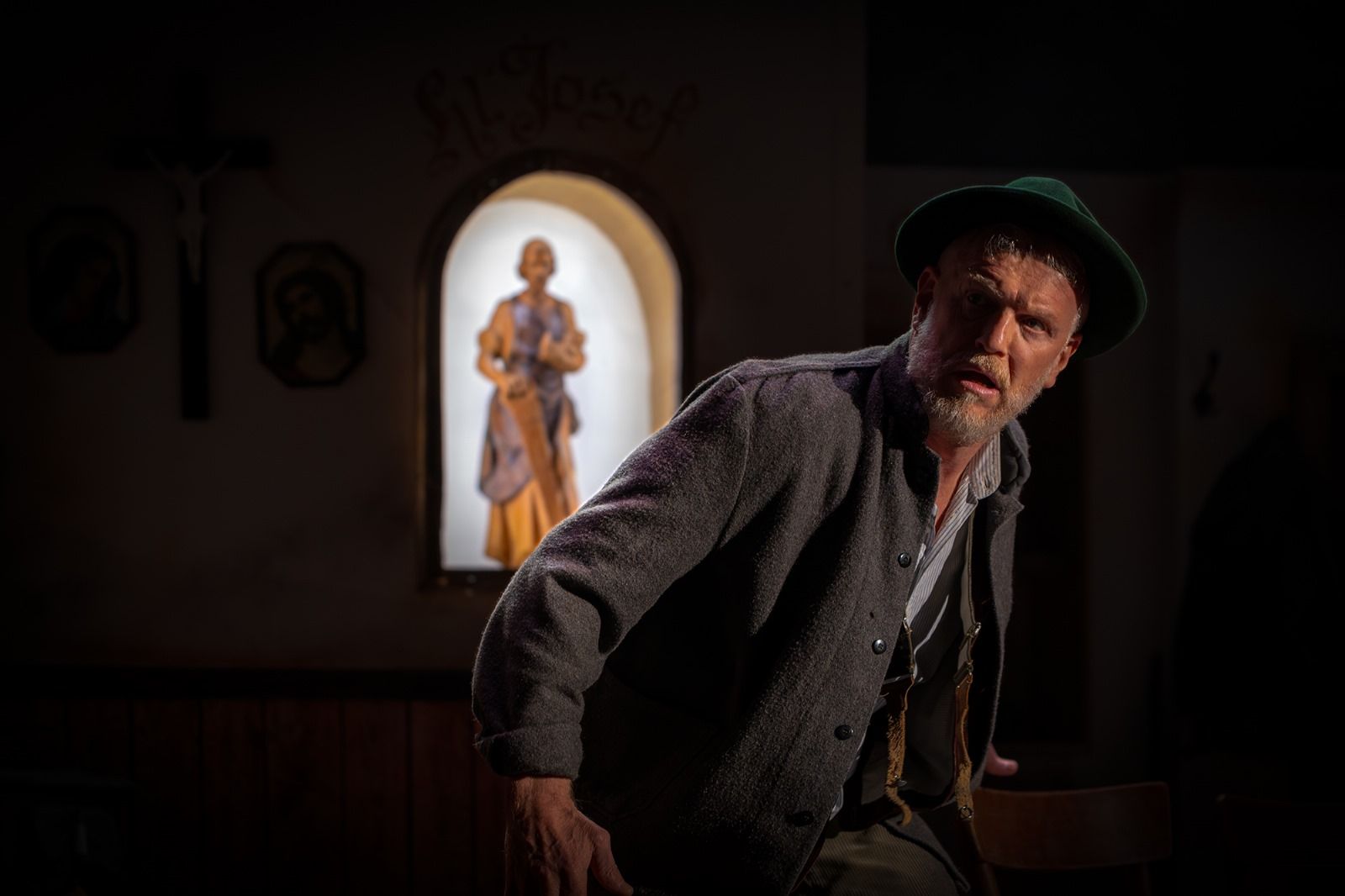 Ein besonderes Ereignis muss den groben, streitbaren Josef Xidinger getroffen und sein Wesen verändert haben. Denn er macht einige besondere Zugeständnisse, die er früher nicht gemacht hätte. Hat der Heilige Josef damit etwas zu tun? Fred Döring als Wirt Roßfeichtl, Wast Liedl als Britschenbichler und Roland Straka als Froschhammer versetzen die Zuschauer in die Wirtshaus-Atmosphäre vor rund 120 Jahren. Zigarrenrauch, derbe Ausdrücke, „Schenkelklopfer“ und Sprüche mit verzerrter Stimme entlocken den Zuschauern immer wieder spontane Lacher. Christina Straka als Agnes und ihr Gspusi, der Xaver Xidinger, gespielt von Christoph Döring, bringen freche und unbekümmerte Momente auf die Bühne, genauso wie der junge Mesner Anderl, gespielt von Johannes Stopfer.