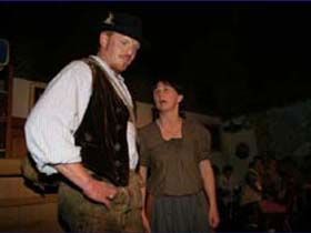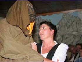 Urwüchsig und stolz wie die mächtigen Tiroler Berge, in denen die Geschichte spielt sind auch die Menschen, um die sich die Handlung dreht. In unbändigem Trotz widersetzt sich Wally ihrem Vater, der ihr den ungeliebten Vinzenz als Bräutigam aufzwingen will. Sie verläßt das Vaterhaus, nimmt Einsamkeit und Not auf sich. Abenteuer, dramatische Szenen, Gefühle, Leidenschaft, Demütigung und zum Schluß ein ... ??? Viele Menschen verbinden mit der Geierwally eine wahre Geschichte, die so wie sie im Film oder auch hier bei uns auf der Bühne erzählt wird, nie passiert ist. Mit richtigem Namen hieß die später unter „Geierwally“ berühmt gewordene Tirolerin Maria Anna Knittel (verheiratete Steiner). Als die siebzehnjährige Büchsenmachertochter in die Hosen ihres Bruders Honnus schlüpfte, da ahnte sie nicht, dass Ihr kühnes Wagnis, einen Adlerhorst in der Saxenwand auszuheben, Geschichte machen würde. Keiner der Burschen aus Elbigenalp hatte den Mut aufgebracht, sich in die wilden Klüfte, dem Madauergrund abseilen zu lassen. Doch die Nanno (so wurde sie im Volksmund genannt) erklärte kaltblütig, dass „sie der Mann dazu sei“ und schwebte bald in halsbrecherischer Höhe ihrem Ruhm als „Geierwally“ entgegen. Ihr Abenteuer vom Adlerhorst bestand sie 1858 und ein weiteres Mal im Jahre 1863.